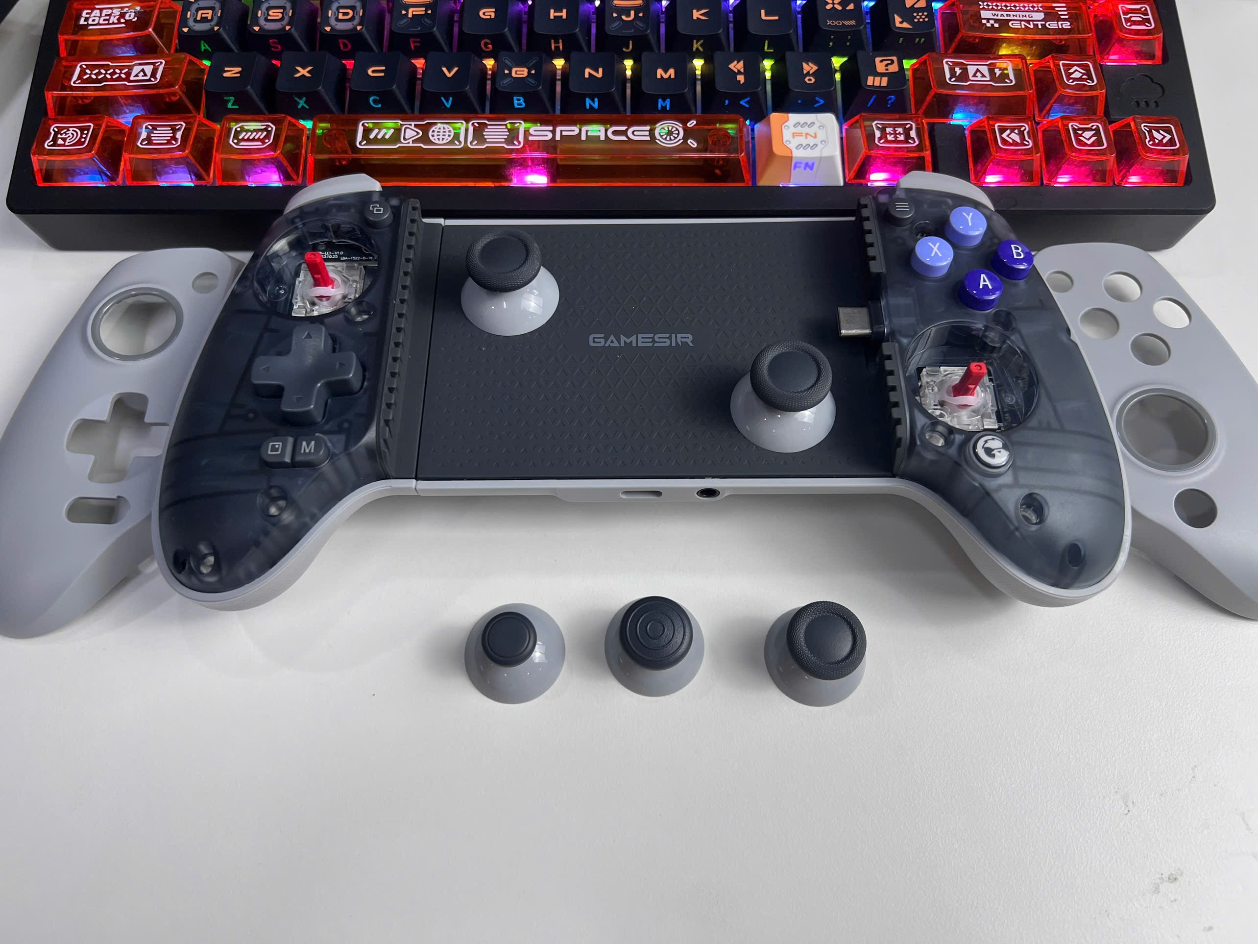 **-** Faceplates của tay cầm GameSir G8 Galelio là nam châm và có thể thay đổi, anh em hoàn toàn có thể thay thế và tuỳ biến để cá nhân hoá tay cầm của mình cũng như vệ sinh khi cần thiết. Ngoài ra bên trong còn tặng kèm cho anh em 3 thumbstick để thay thế ( 2 mặc định trên tay và 3 tặng kèm trong hộp )