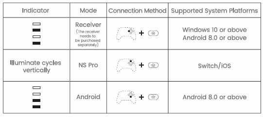 <table><thead><tr><th width="197">Chỉ báo</th><th>Ý nghĩa</th></tr></thead><tbody><tr><td>Nhấp chậm</td><td>Trạng thái kết nối lại. Tay cầm chỉ có thể kết nối lại với thiết bị đã ghép đôi trước đó. Nhấn giữ nút Screenshot và Home trong 3 giây để chuyển sang chế độ ghép đôi.</td></tr><tr><td>Nhấp nhanh</td><td>Đang ở chế độ ghép đôi, có thể được phát hiện bởi các thiết bị. Sau khi ghép, sẽ tự động chuyển sang trạng thái kết nối lại ở các lần sau.</td></tr><tr><td>Sáng liên tục</td><td>Đã kết nối thành công. Nhấn giữ nút Home trong 5 giây để tắt nguồn.</td></tr></tbody></table>
